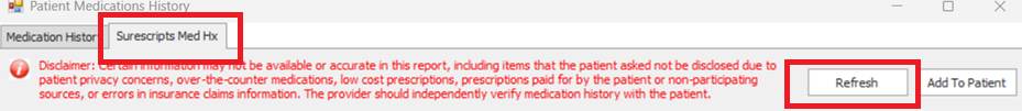 -Once this pop up comes up, you will go to ‘Surescripts Med Hx’ tab at the top. Then click refresh.