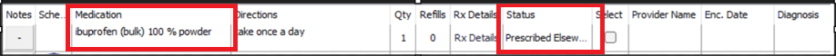 -Once you have checked the medication and selected ‘add to patient’, now in the chart you will see this has been added in the status ‘Prescribed Elsewhere’.