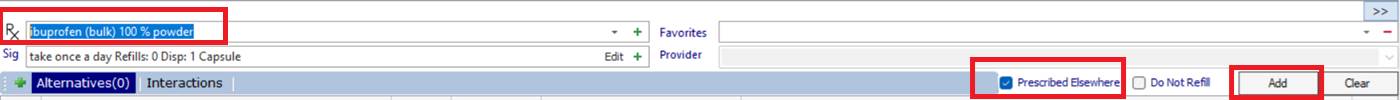 -Then before you select ‘Prescribe/Add’ to add this to the chart, you will see to the left of the ‘Prescribe/Add’ button is a check box ‘Prescribed Elsewhere’.